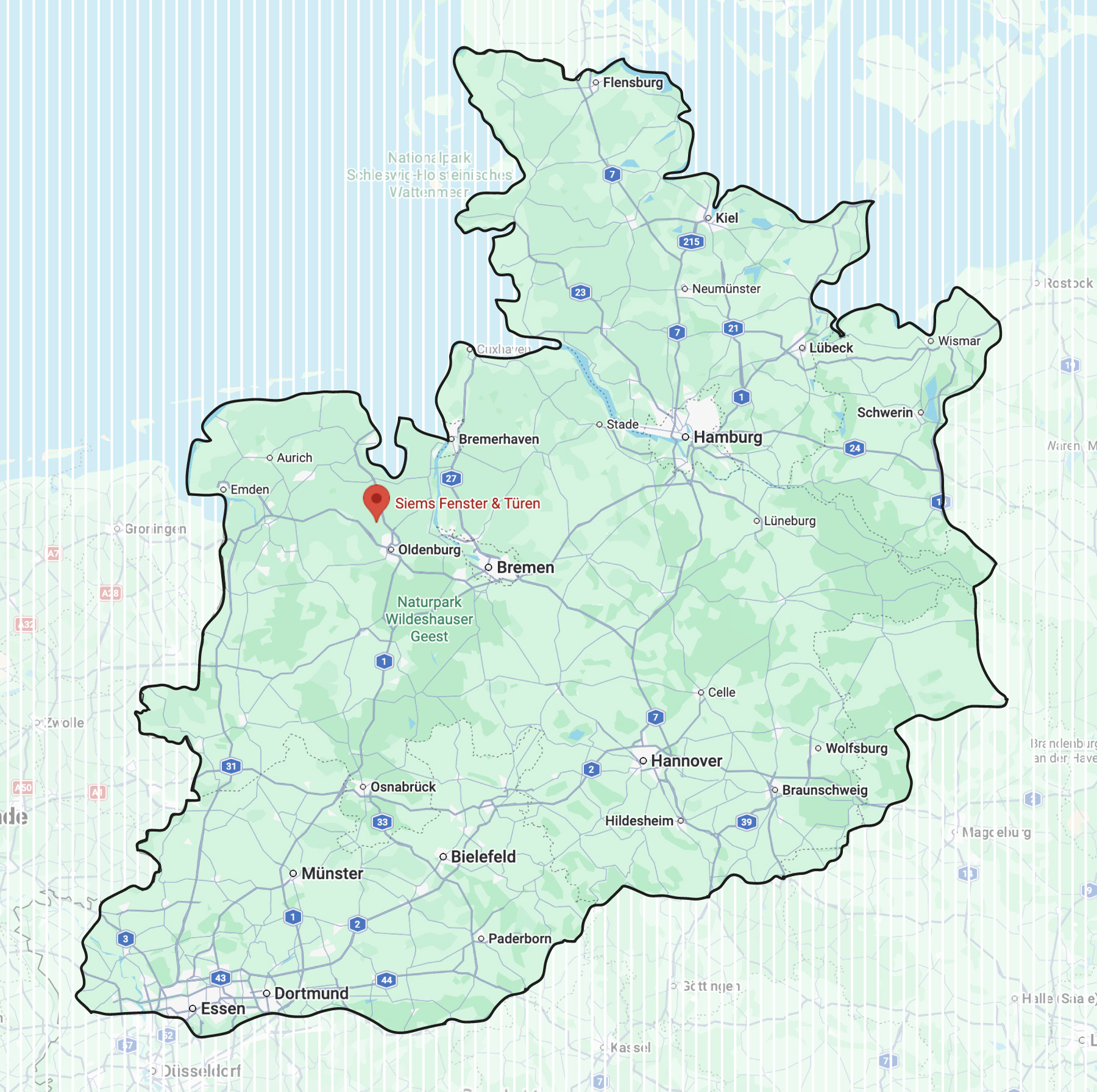 Von unserem Standort in Wiefelstede aus beliefern wir zahlreiche Städte und Regionen in Niedersachsen, Bremen, Hamburg, Schleswig-Holstein sowie große Teile von Nordrhein-Westfalen.